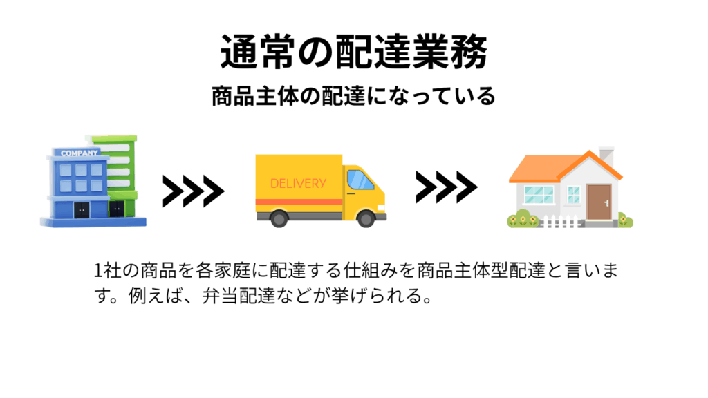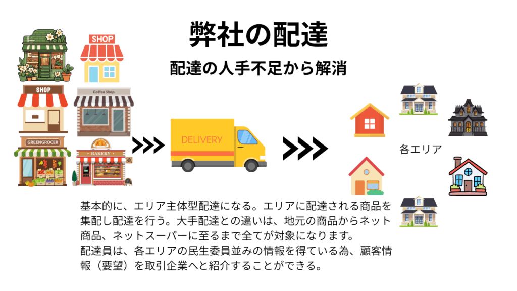 各店舗の商品を集配し配達します。利点は、店舗の配達員を減らすことができます。また、配達事業をされていない店舗はに配達事業に参入できます。店舗が少し不便(駐車場がないなど)でも参入できます。他社の顧客にアプローチできます(弁当を注文された方がケーキを欲しがっている場合チラシなどで紹介できる)しかも弊社が御社の広告も担当します。欠点は、一般的ですが顧客の情報が弊社にしか蓄積されません。しかし顧客層(他社の個人情報は開示しません)などのデータは開示します。